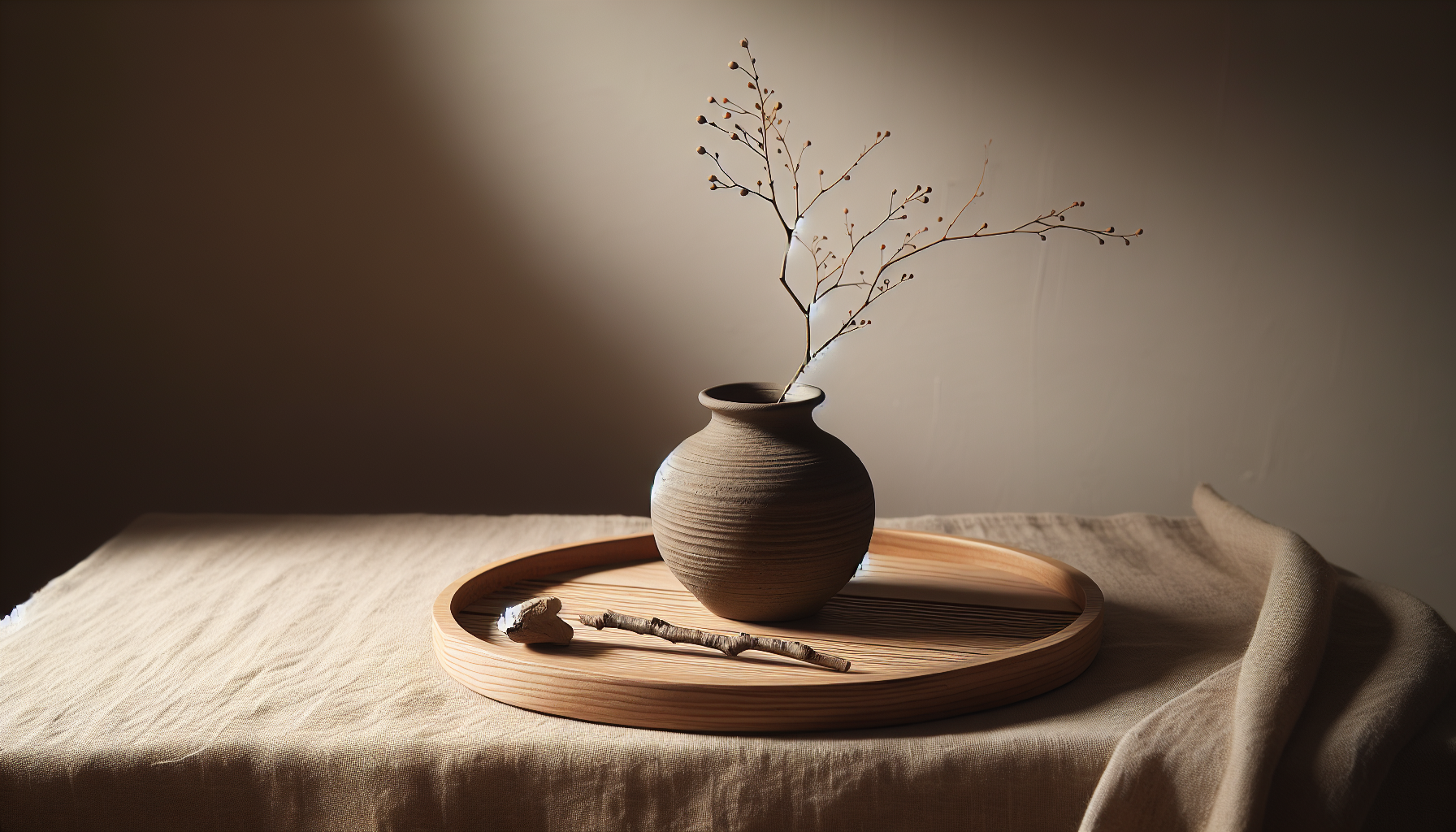- One handmade ceramic vase and a folded wool throw are the only accessories.
